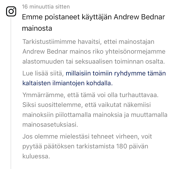 Oh cool, my Instagram “For You” feed just served me a promoted post with borderline porn. Full-nudity image carousel, nothing “artistic” about it. Reported it, naturally — but guess what? “Doesn’t violate community guidelines.” Of course not. Why would it? 🙃